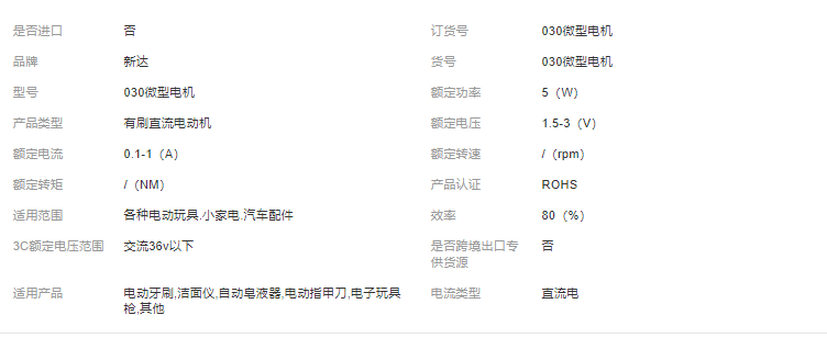 本网页所展示的有关【030微型电机 洁面仪小家电直流电机 电动马达儿童玩具 振动小马达_电机_揭阳市榕城区新达微型电机厂】的信息/图片/参数等由全球零部件网的会员【揭阳市榕城区新达微型电机厂】提供,由全球零部件网会员【揭阳市榕城区新达微型电机厂】自行对信息/图片/参数等的真实性、准确性和合法性负责,本平台(本网站)仅提供展示服务,请谨慎交易,因交易而产生的法律关系及法律纠纷由您自行协商解决,本平台(本网站)对此不承担任何责任。您在本网页可以浏览【030微型电机 洁面仪小家电直流电机 电动马达儿童玩具 振动小马达_电机_揭阳市榕城区新达微型电机厂】有关的信息/图片/价格等及提供【030微型电机 洁面仪小家电直流电机 电动马达儿童玩具 振动小马达_电机_揭阳市榕城区新达微型电机厂】的商家公司简介、欧宝(中国)等信息。